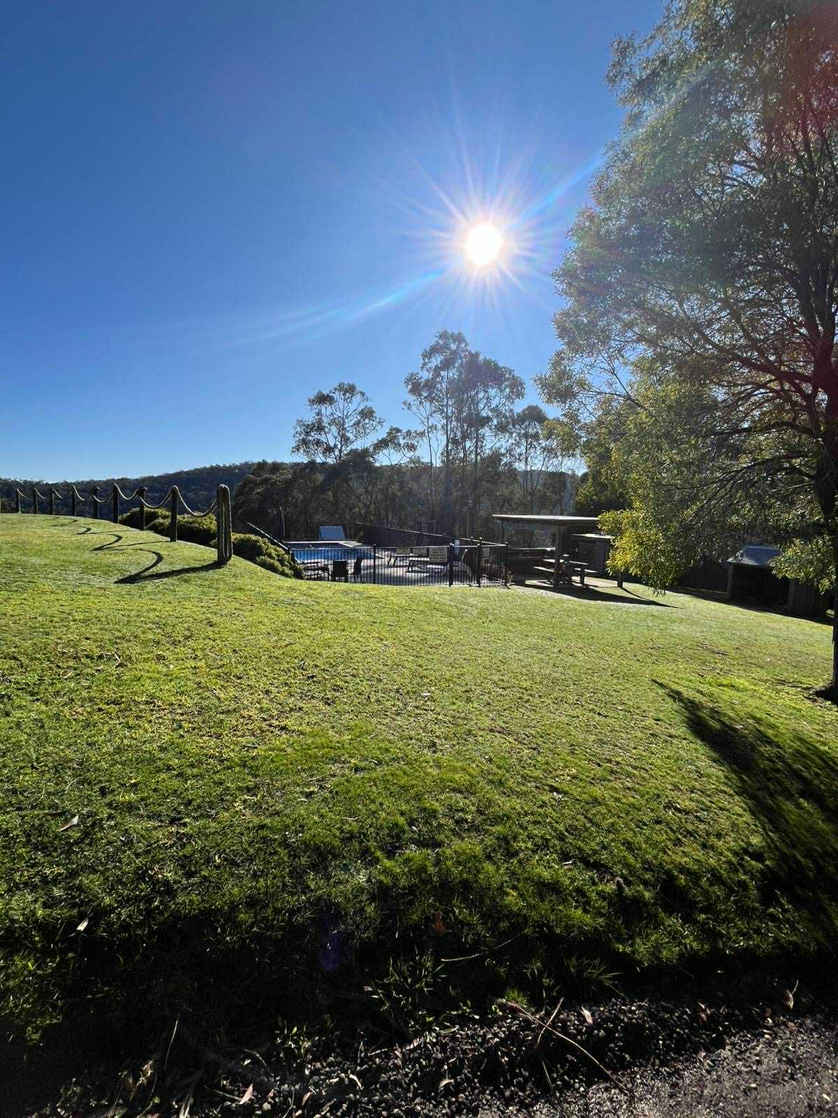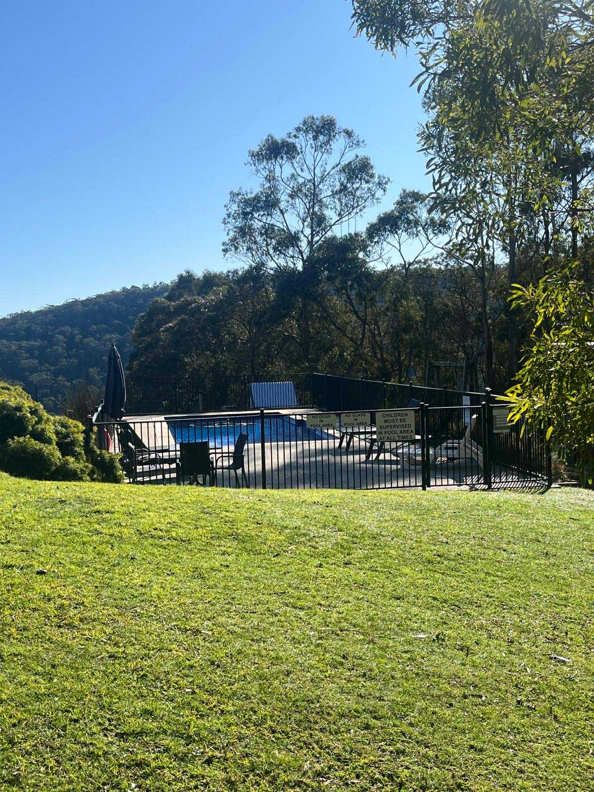 To reach the pool, guests walk across a grassy area with some gentle slopes. The ground is uneven in places, so it may be a little challenging for those with mobility needs.