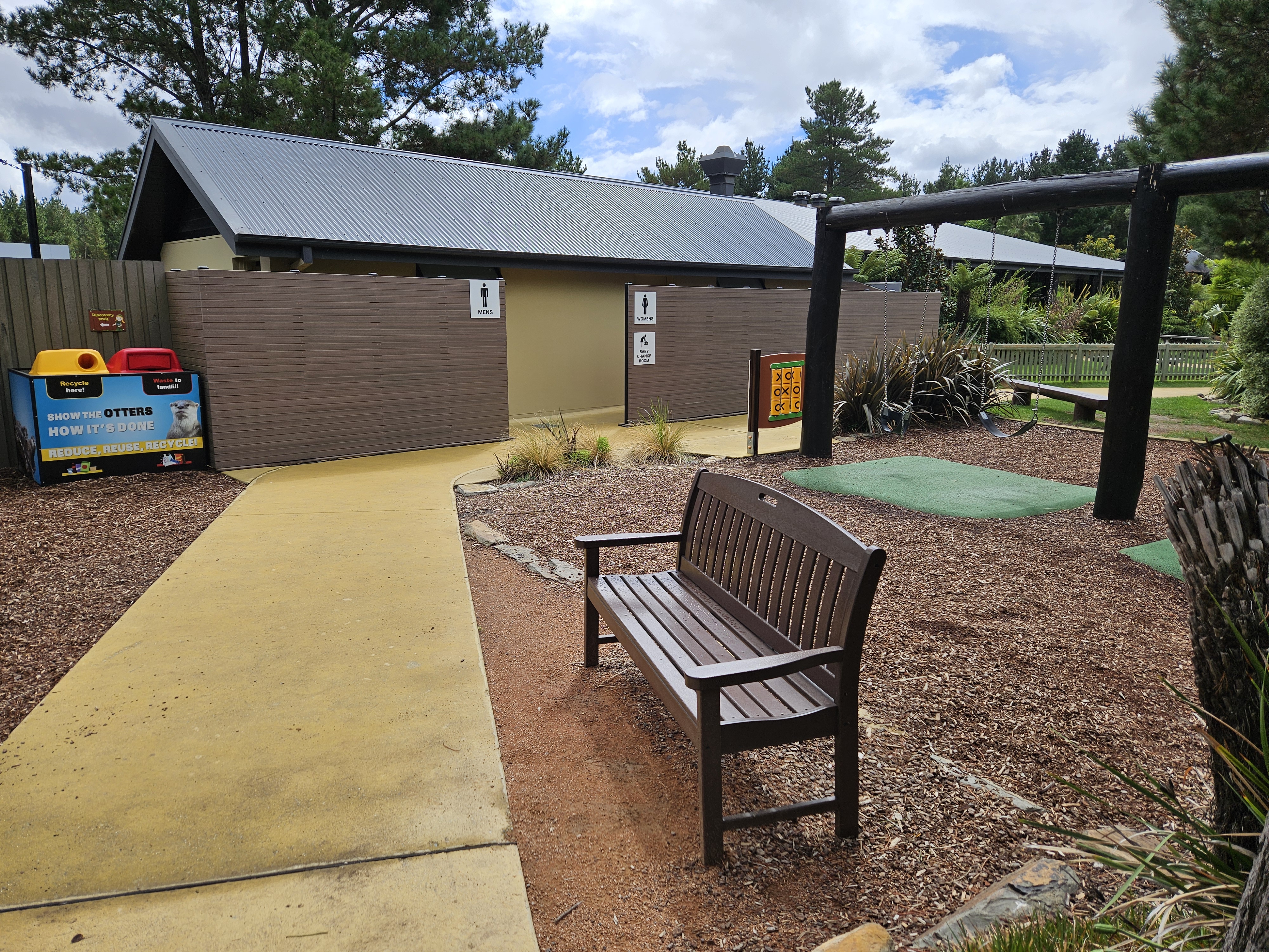 Some enclosures have binoculars to view the animals. Public toilet doors have braille included in the sign.