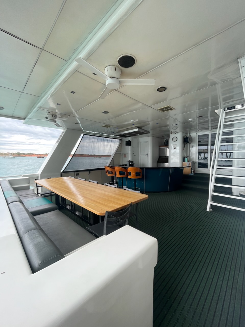 External stairway to the upper deck does not have an enclosed riser. Internal stairways and external stairway to the swim platform have enclosed risers.