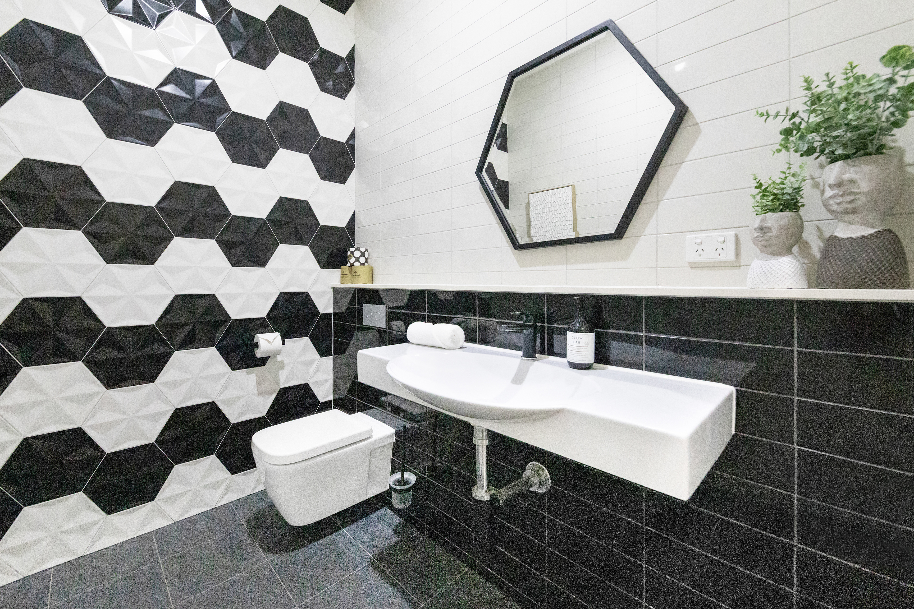 Floors, walls, counters and furniture are of contrasting colours