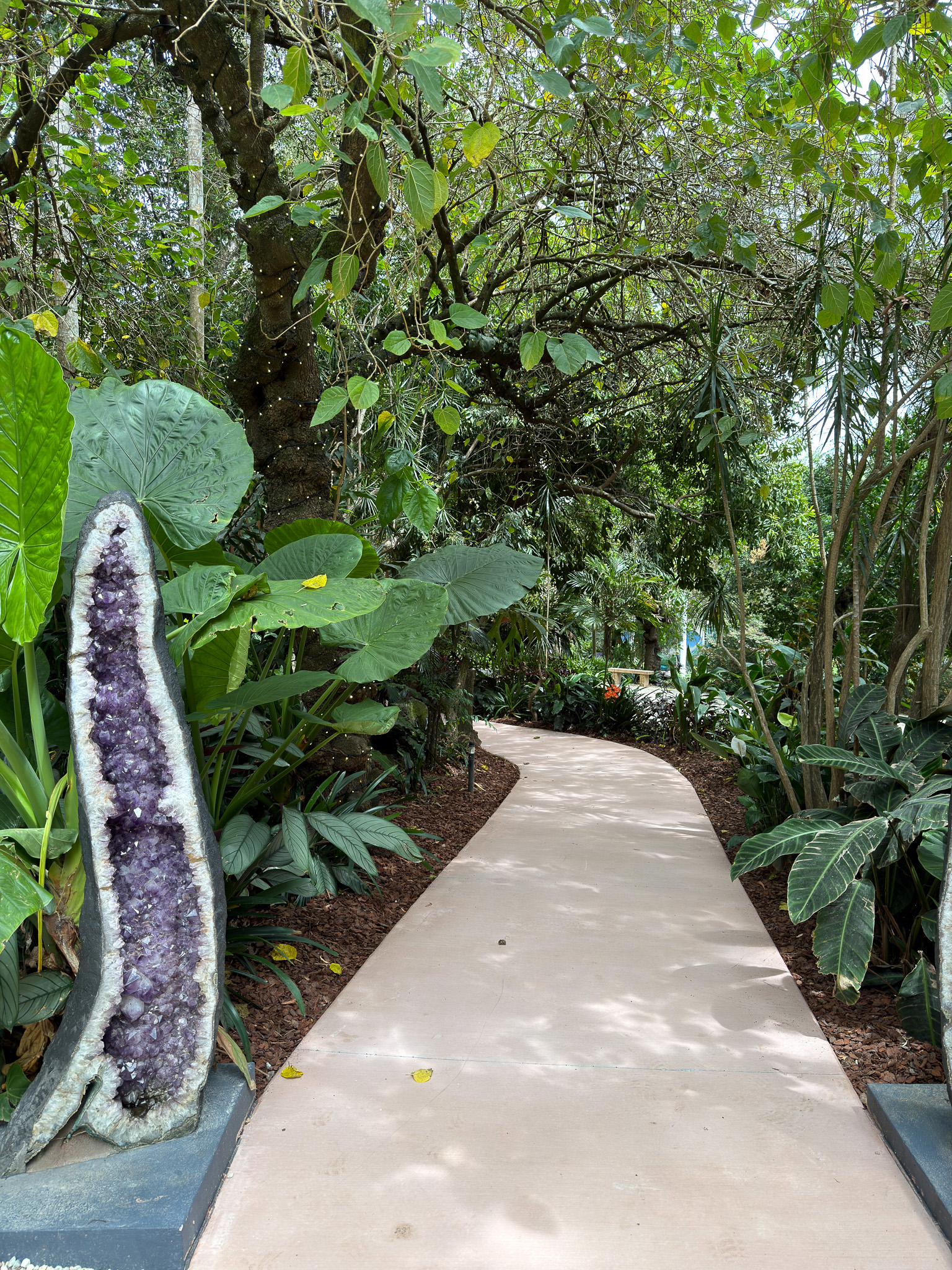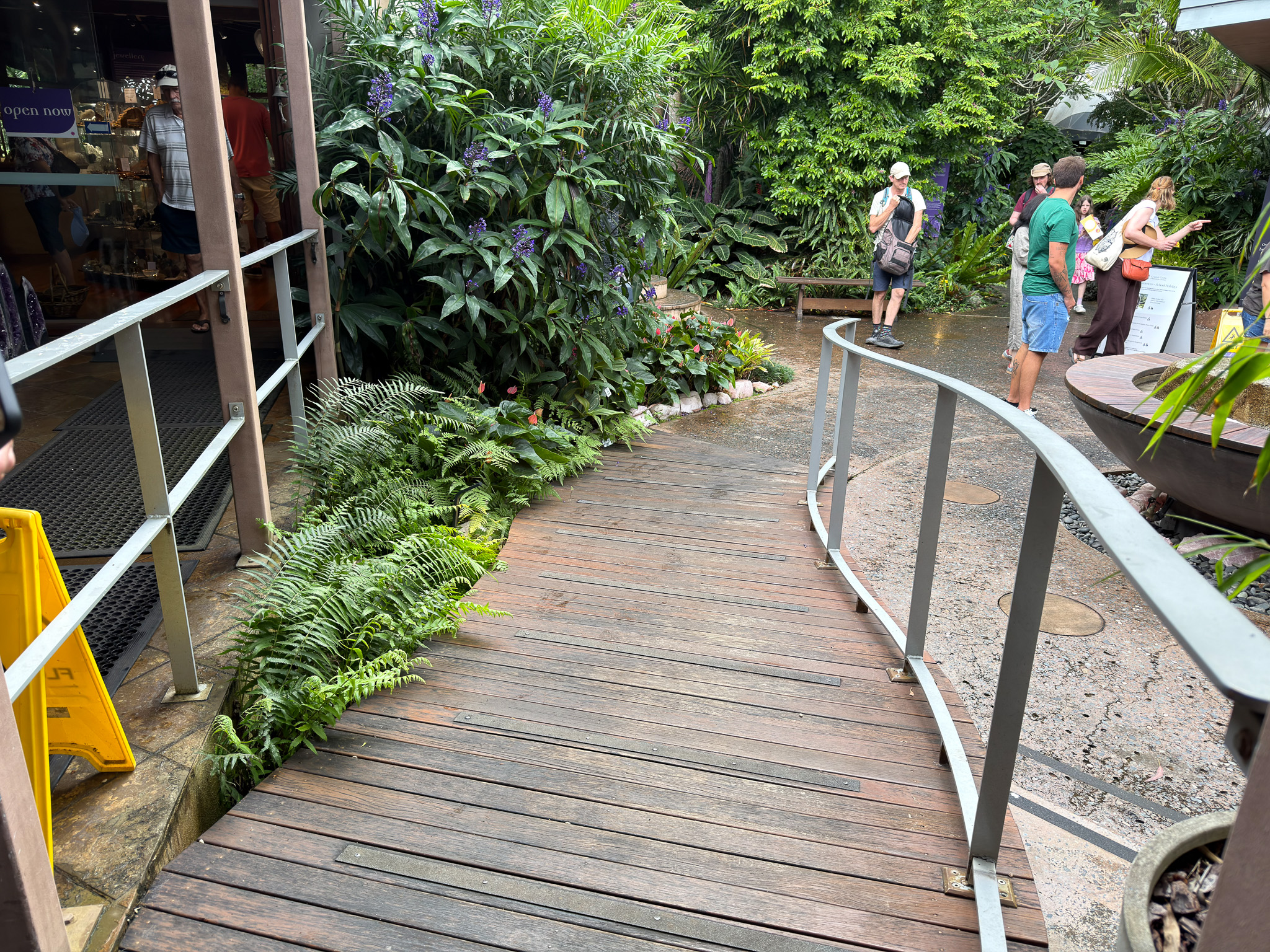 Crystal Castle has two areas with stepped pathways in our hillside gardens — Bamboo Avenue and Rainforest Walk. These are accessed by steps without handrails and are clearly signed as non-wheelchair accessible. These areas fall outside the designated accessible route and guests are advised of this at the Welcome Hut on arrival. The accessible pathway network is step-free, using sealed concrete paths and ramps throughout, meaning guests on the accessible route do not encounter open sets of steps. Guests requiring step-free access can reach the majority of our key attractions via this route, and our team at the Welcome Hut can advise on the best path for individual needs.