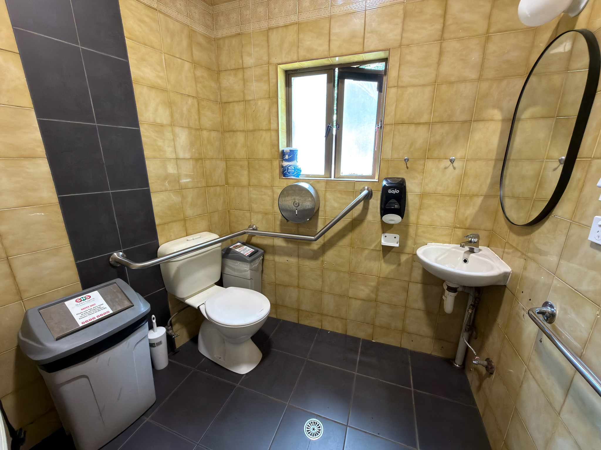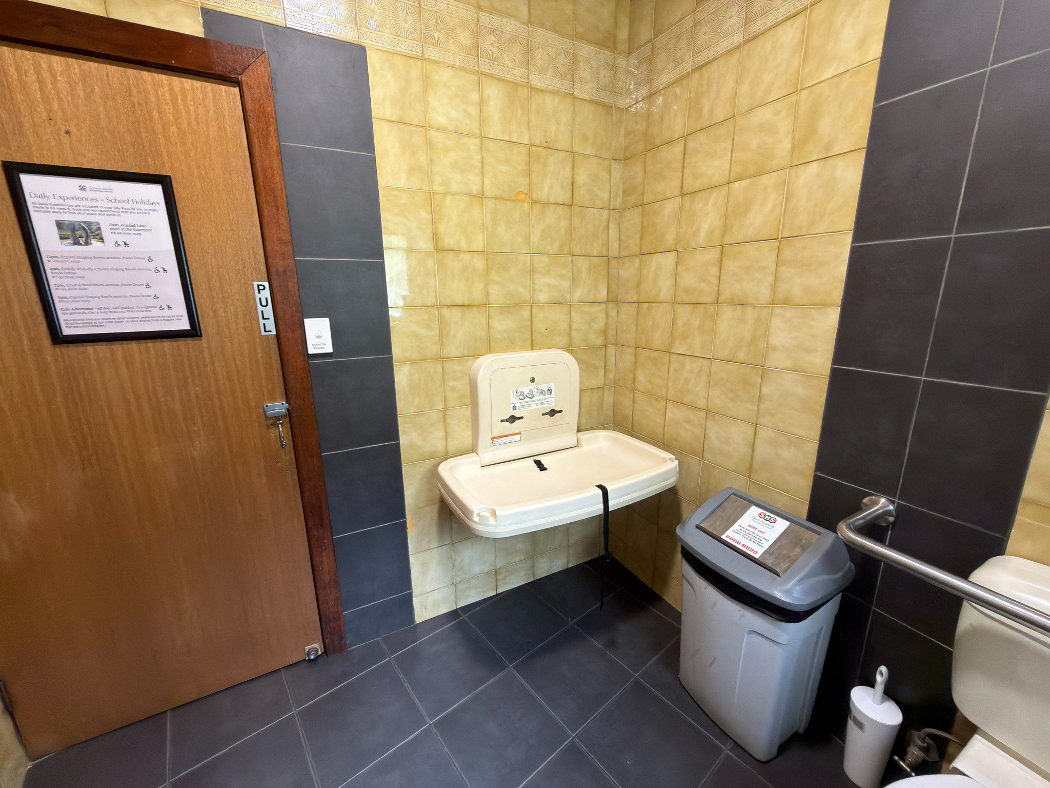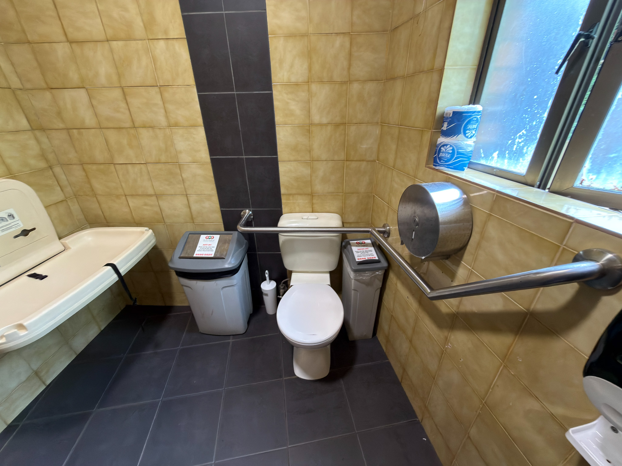 Our accessible toilet is located inside our Moon Room retail space. The door width is 800mm, and the corridor leading to that door is 900mm. Clear space in front of the toilet is 1400mm, and the seat height is 400mm. The facility includes handrails and a contrasting toilet seat. We are reviewing options to improve these dimensions as part of future upgrades.