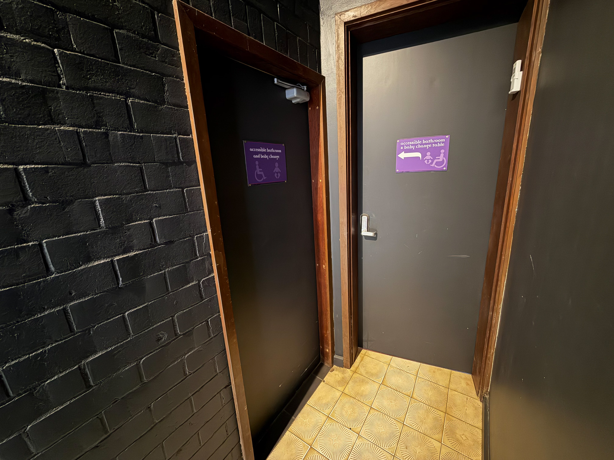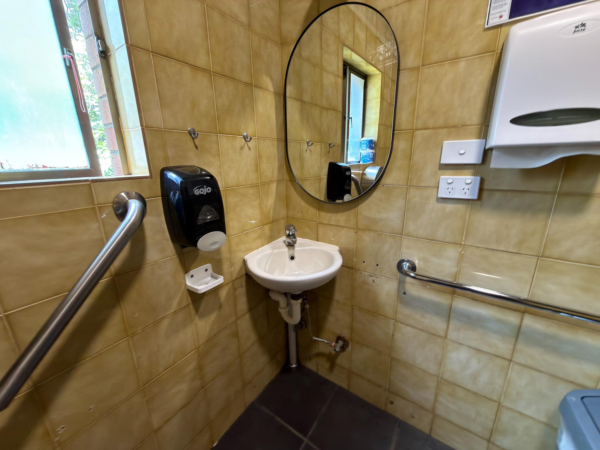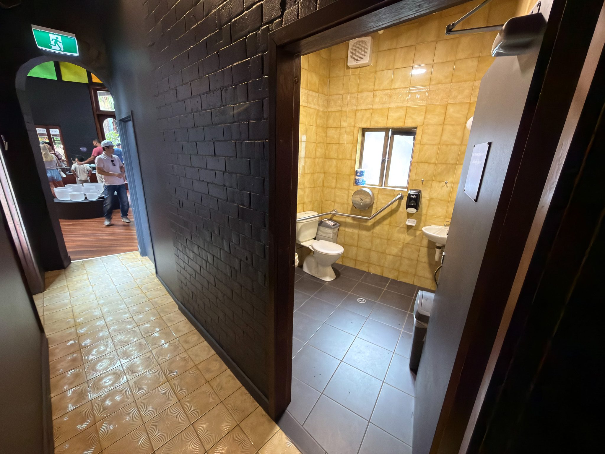 Our accessible toilet is located inside our Moon Room retail space. The door width is 800mm, and the corridor leading to that door is 900mm. Clear space in front of the toilet is 1400mm, and the seat height is 400mm. The facility includes handrails and a contrasting toilet seat. We are reviewing options to improve these dimensions as part of future upgrades.