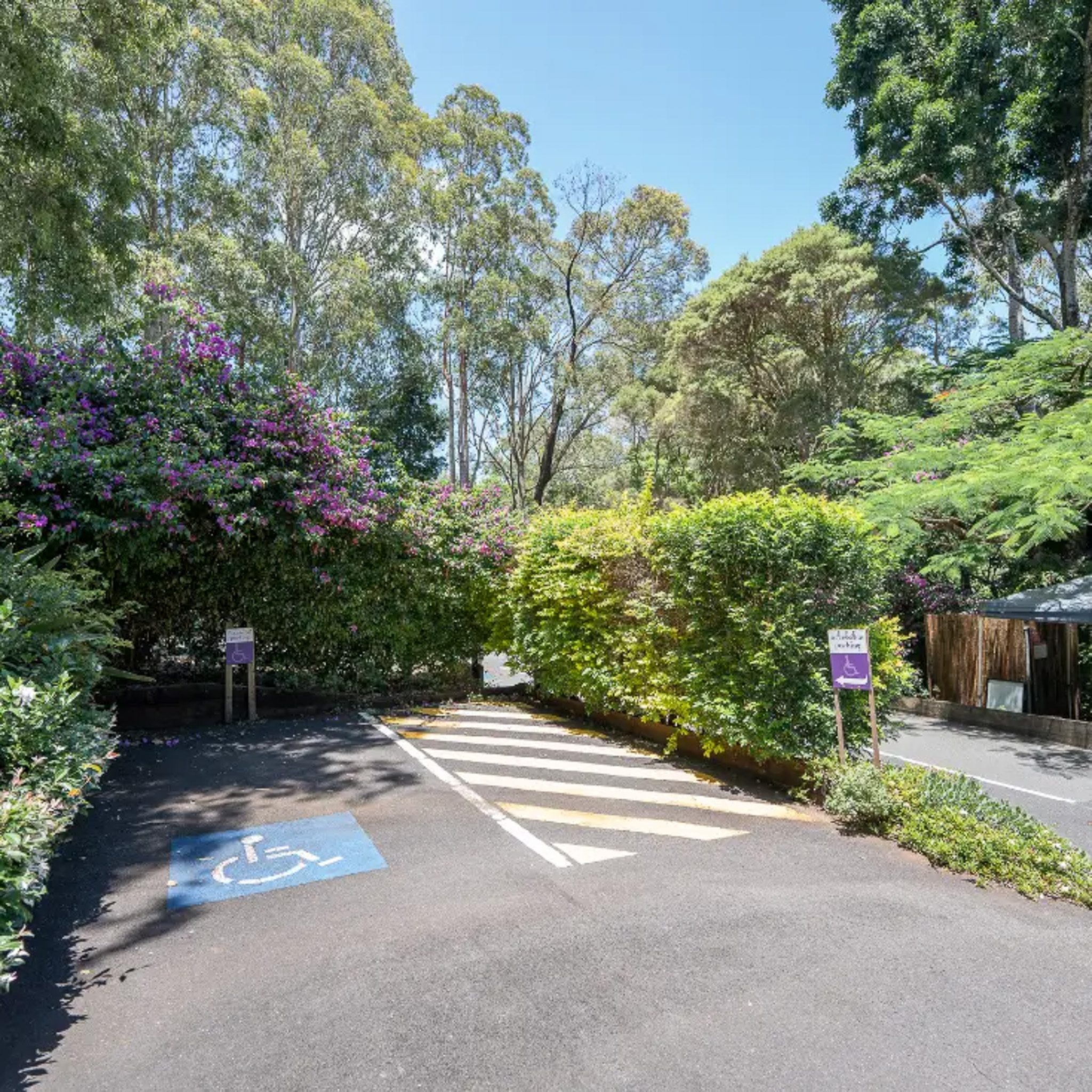 Two designated accessible parking bays are located adjacent to our Welcome Hut, providing the shortest and most level route to the entrance. A drop-off zone is available near the Welcome Hut for guests who need to be dropped close to the entry. The car park surface is sealed asphalt. Crystal Castle is located in a rural hinterland area without direct public transport, so we recommend private vehicle or shuttle services from Byron Bay. Kerb ramps are in place where pathways meet sealed surfaces. Staff are present in the carpark during busy periods and can direct guests to the accessible bay on arrival.